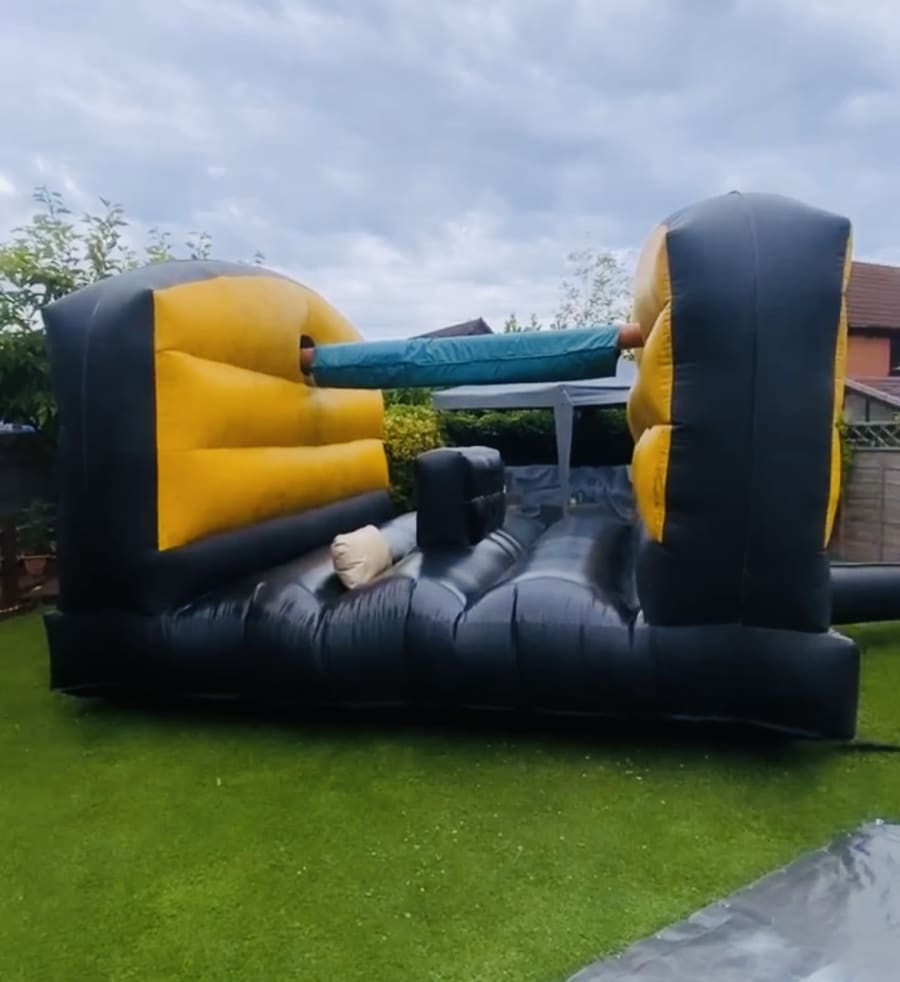 The fun doesn’t stop when you’re knocked off—land safely on the bouncy castle bed below and be ready to jump back into the action. It's the perfect addition to any party, offering a great mix of fun and friendly competition.
