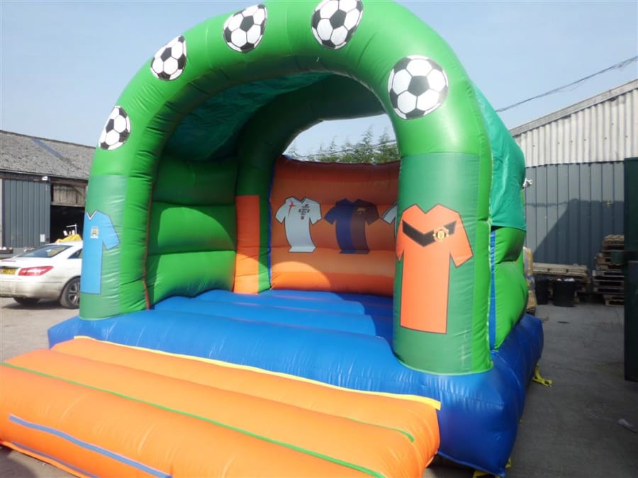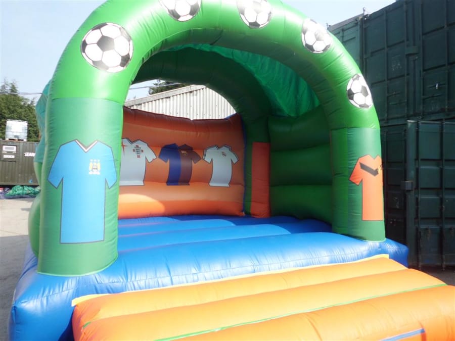 Suitable for football fans of all ages, this 15x15ft football bouncy castle features shirts from all the best teams including Manchester City and Manchester United, as well as Real Madrid and more.