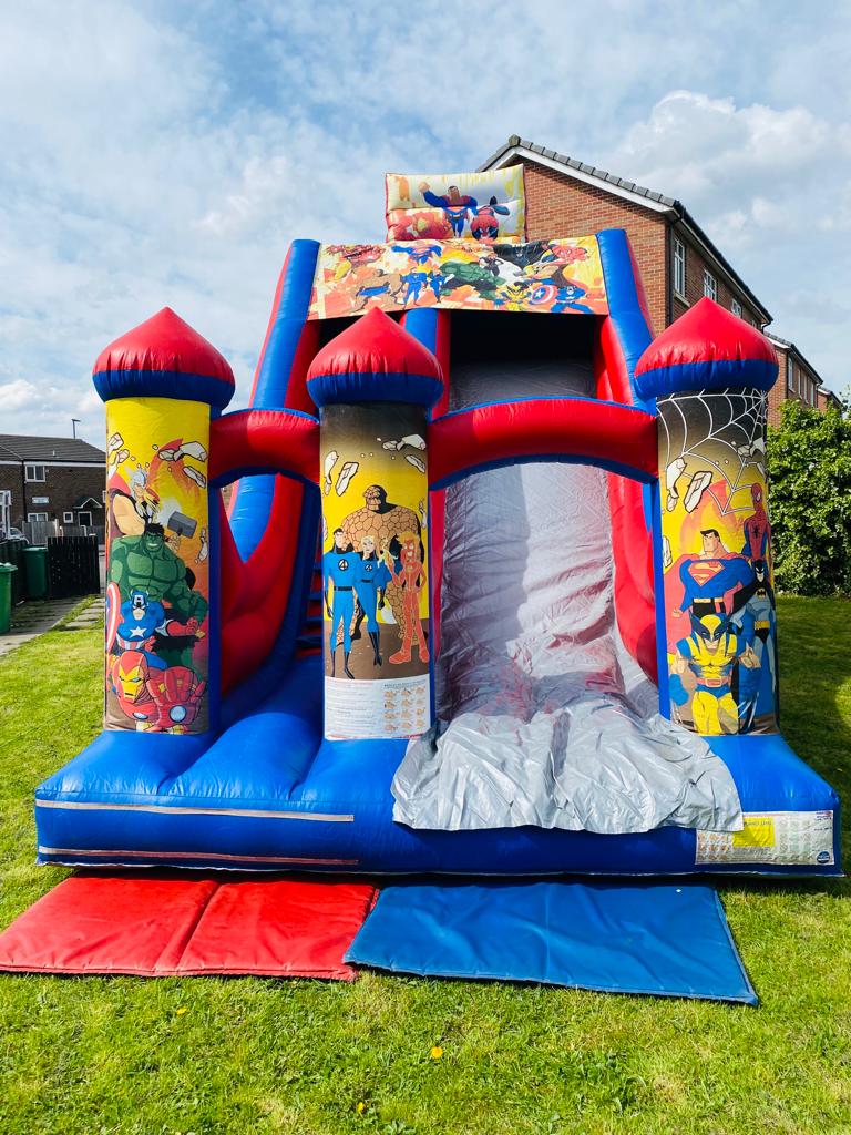 THIS IS OUR BRAND NEW 26FT HIGH SUPER HERO BOUNCY CASTLE SLIDE